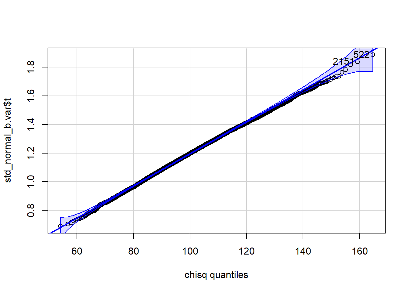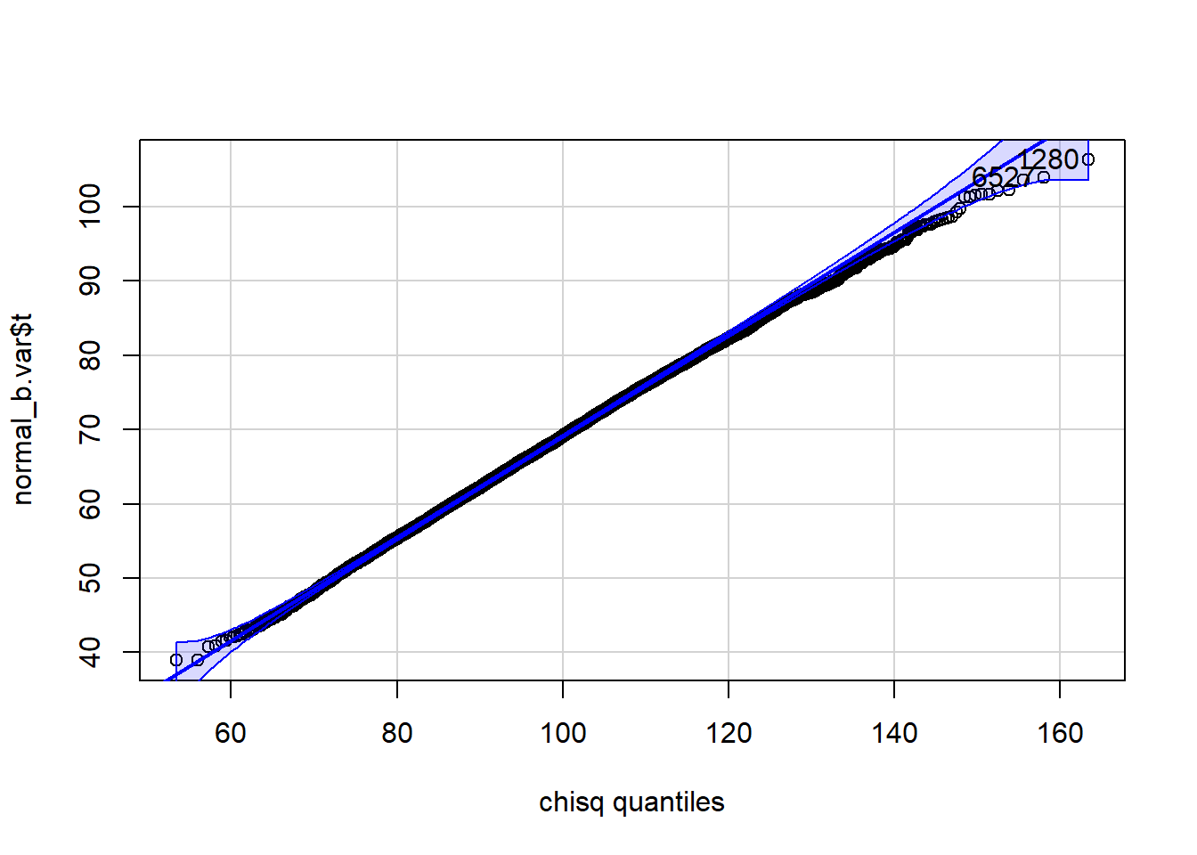 qqPlot(normal_b.var$t, distribution="chisq", df=n-1)