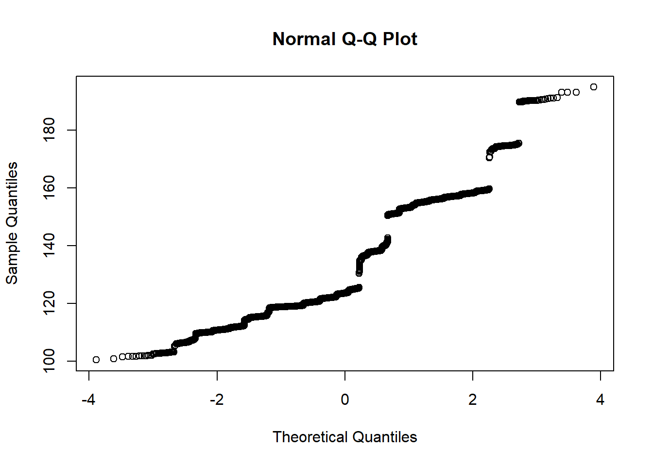 While the raw data appear to be non-normally distributed — abnormal? — the distribution of means seems to be normal. Apparently the Central Limit Theorem has kicked in. Note that the estimator appears to be unbiased. The standard error is estimated to be 9.444389. This is close to s/\sqrt{n}= 9.6423954. All of this is interesting and useful — later.